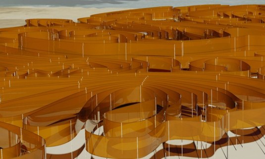 Light Sanctuary (an empowered landscape for the UAE ): a 40-kilometre long ribbon of vertical solar panels, raised on slender masts above the desert. The thin-film technology can absorb light from a range of angles, and the vertical panel orientation minimizes sand build-up.