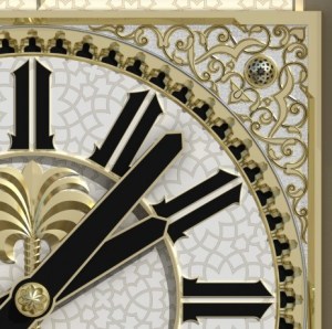 Mecca Clock Tower – Clock Faces: ‘The ornament throughout each face is glass mosaic tesserae with inset LED light fixtures for nocturnal illumination. The glass mosaics are set onto rigid carbon-fiber composite, and the floral design in each corner of the face is in high relief. The style of the floral ornament is in the pan-Islamic style first developed by Jay Bonner for the Sliding Domes at the Prophet’s Mosque in Median’. Taken from the Bonner Design Consultancy site. /