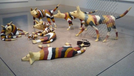 Fruit Bats sculpture: materials used polychromed fibreglass sculptures, polychromed wooden disks, Hills Hoist clothesline /