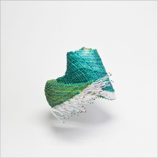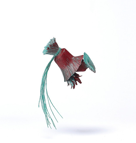 The jewellery of Korean, Jimin Kim, whose ‘memories become a shape & paper is cut with those shapes. Dozens of cut papers are folded & combined’. See Blogroll for a link.