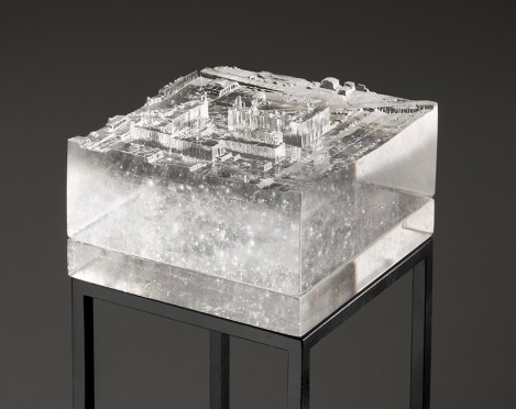 “The installation Cities: Departure and Deviation is comprised of 24 blown-glass forms based on three-dimensional rotations of statistical data for major urban centers in the United States. The blown-glass objects, created entirely in shades of clinical white, black and gray, reference the weight and precision of hanging plumbs and the precariousness of spinning tops” /