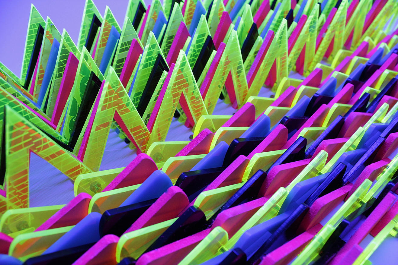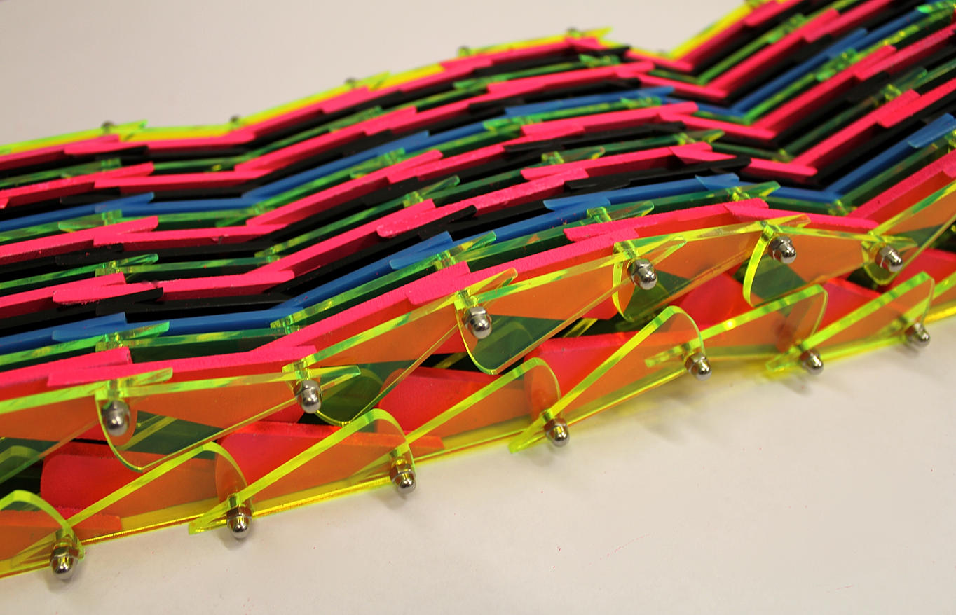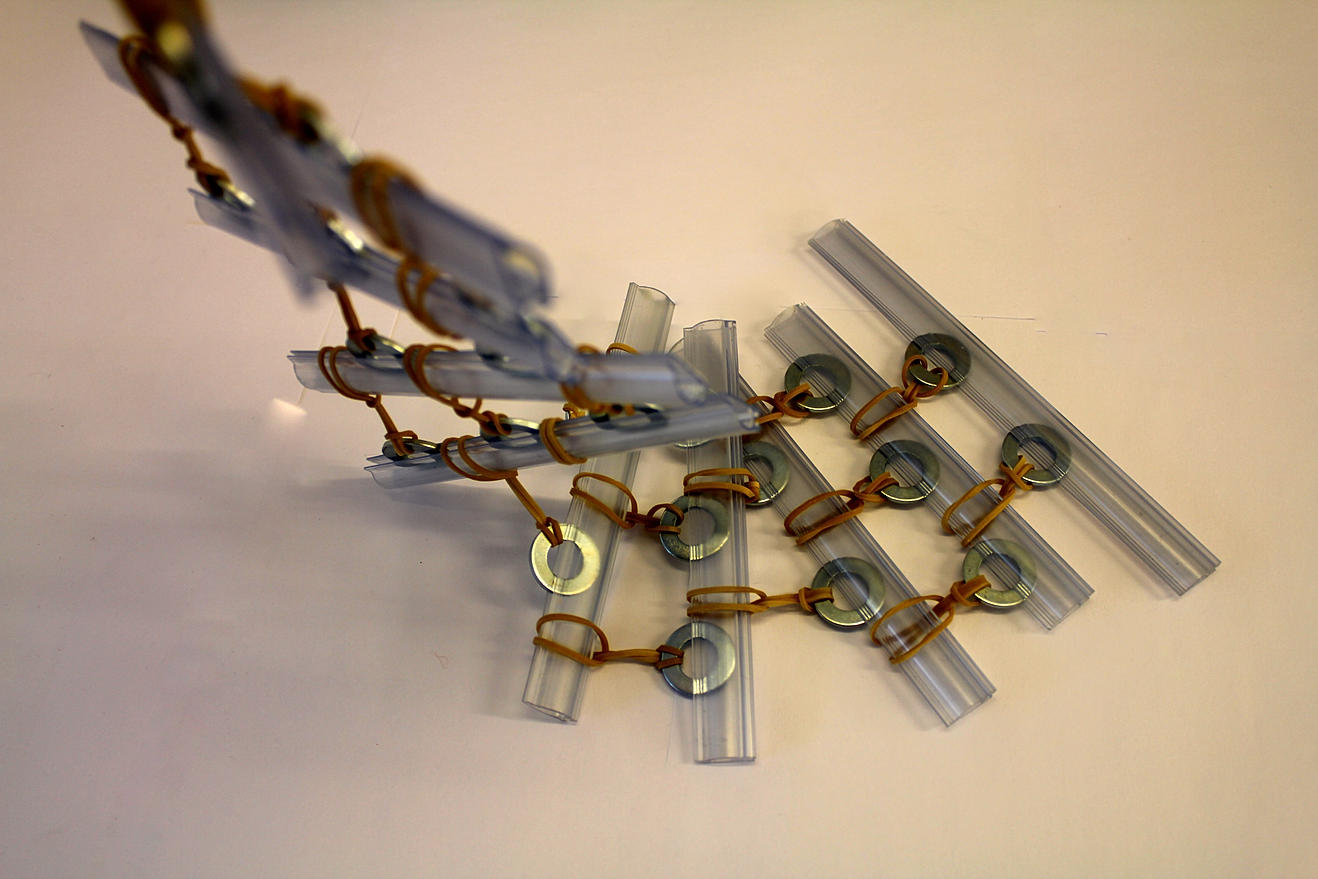 Engineered structures, resulting in malleable forms, utilising acrylic, wood and metal. /