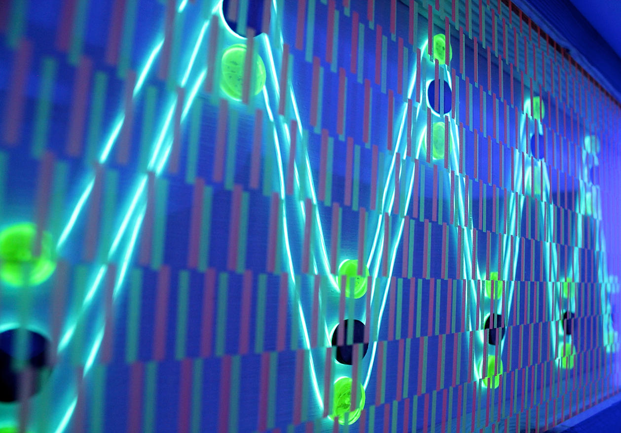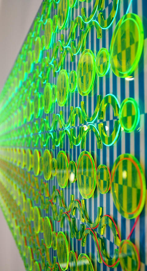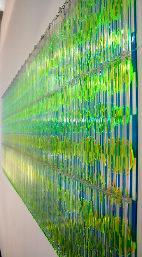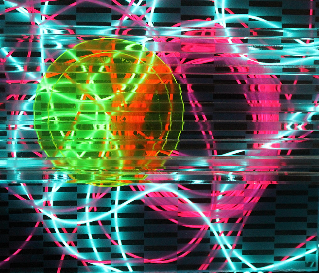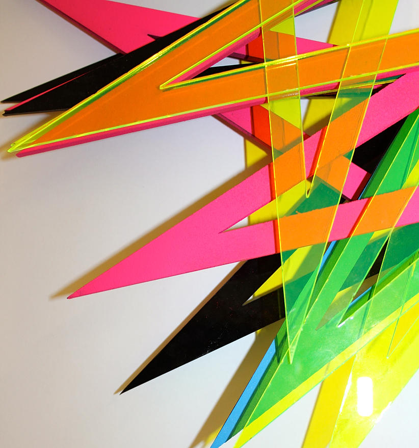 Elizabeth creates Illusions of line, light and colour through acrylic, ell wire, metal and wood /