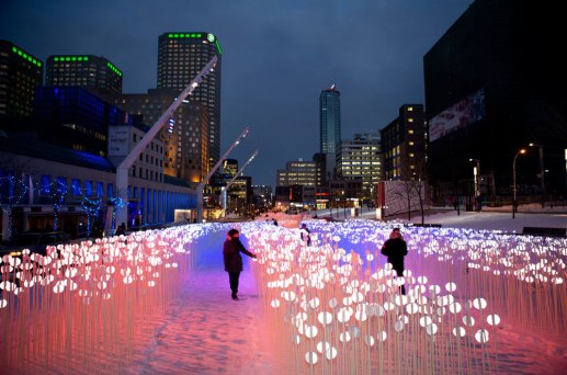 Entre le rangs, Montreal: the public installation is the winning entry of the 4th annual Luminothérapie competition, Montreal. The thousands of flexible stems topped with white reflectors of the installation, reference Quebec’s wheat fields. Installed in collaboration with Boris Dempsey, Pierre Fournier, Amenagement Cote Jardin, Lucovic Lefevere (Udo Design), Patrick Wilson & Marouane Sahbi