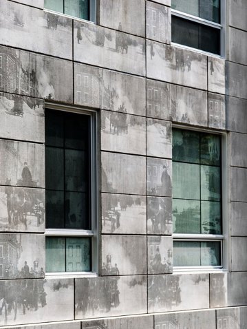 Edison Residence, Montreal urban renewel – photo-engravure on concrete walls symbolises the history of the site /