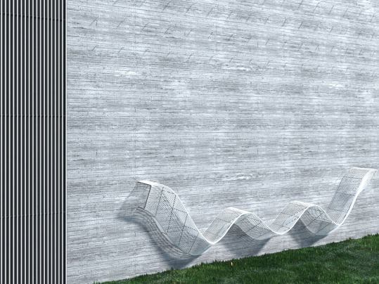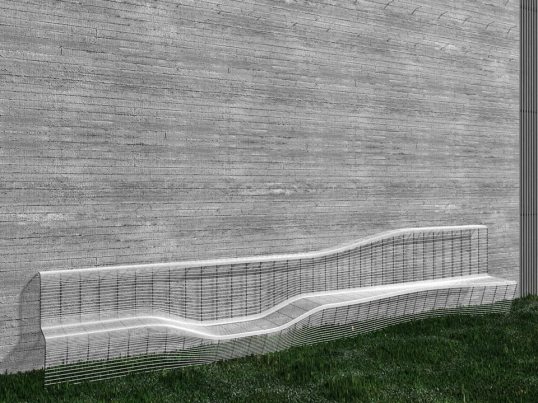 Public bench for two on the steel rod clad concrete wall /