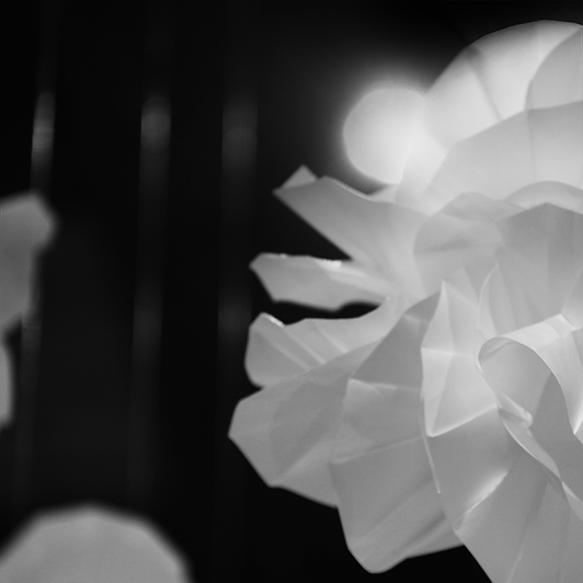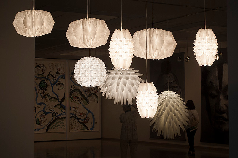 Anemoi Light Art – Eurus: High-tec Kozo, plastic, stainless steel, LED, folded from 144 pieces of cut High-tec Kozo paper. LED globe to provide warm and bright light /