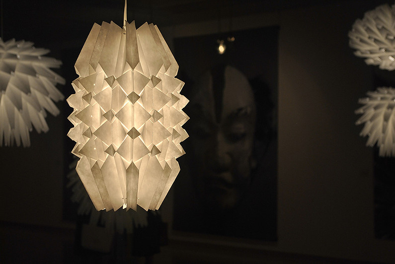 Kawasaki Light Art – Coralina (L) Diameter 24″ Tyvek, Plastic, Stainless Steel, LED. Folded from one piece of uncut Tyvek structural paper /