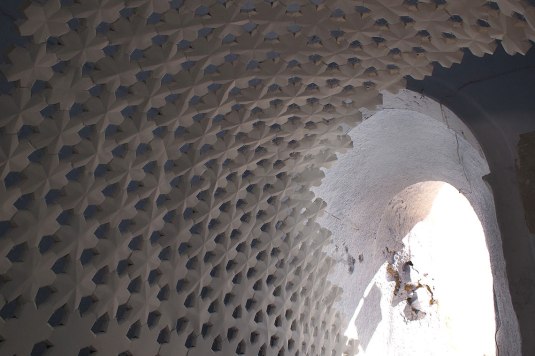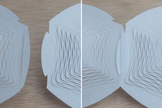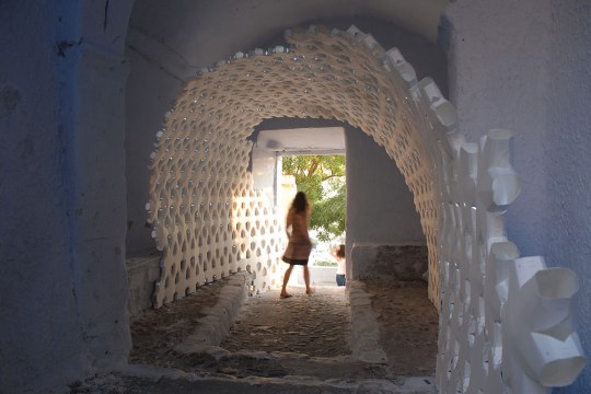 Daphne installation – Santorini, Greece, ‘is a site-specific installation situated within the tunnel stairway that interplays with the notion of concealing and revealing the ancient interior surfaces of the tunnel leading to the peak of Pyrgos. Made entirely of self-supporting paper panels’ /