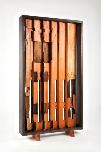 Keyaki Screen: ‘A single king post from a Japanese farmhouse was resawn into a six piece flitch to create this room divider. The screen features a dovetailed oak frame and Japanese Elm (Keyaki)’ /