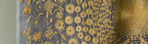 Gold, machine-embroidered, tracery: Kate Wells, UK, is ‘inspired by the works of Medieval goldsmiths & jewellers’. See Blogroll for a link.